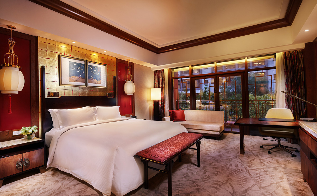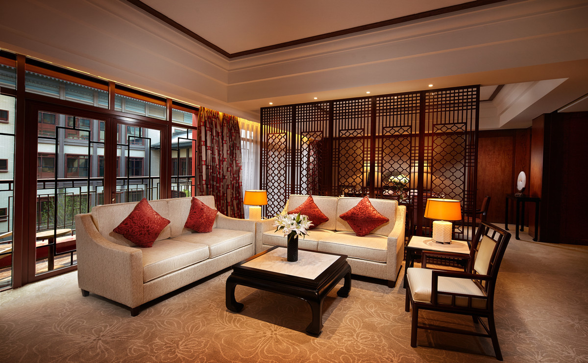 酒店以清代王府為設(shè)計(jì)藍(lán)本,占地8萬(wàn)平米,共由5幢客房主樓以及5座大小不一的庭院組成。