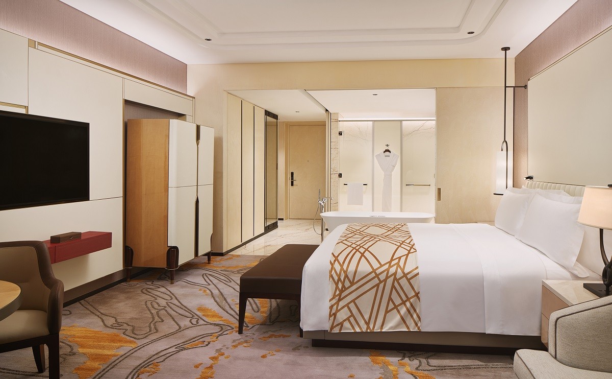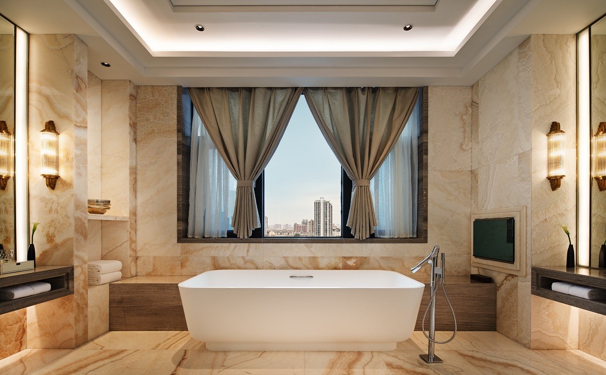 在豪華客房尊享舒適奢華體驗(yàn)??头棵娣e達(dá)45平方米,配有舒適的工作區(qū)域,知名品牌的洗護(hù)套裝,高速互聯(lián)網(wǎng)連接,此外,云石浴室設(shè)雙臉盤、浴缸及獨(dú)立淋浴間。