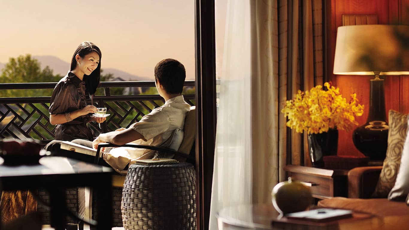 面積達(dá) 125 平方米(1,345 平方英尺)的迎賓區(qū)設(shè)有一個(gè)可眺望荷塘垂柳優(yōu)美景觀的陽臺(tái),是活動(dòng)前后社交或享用茶點(diǎn)的理想場所。