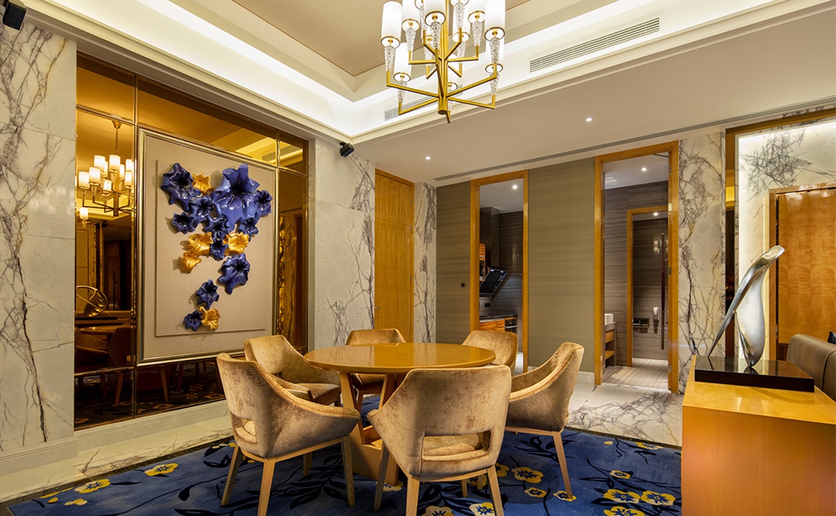 奢華氣派的總統(tǒng)套房,一切精心設(shè)計(jì)只為提供非凡卓越的入住體驗(yàn)。總統(tǒng)套房配置寬敞的客廳區(qū)域、可供多人同時(shí)用餐的圓形餐桌、獨(dú)立衣帽間與化妝間、設(shè)備齊全的廚房、奢華浴室設(shè)有獨(dú)特洗浴裝置及高清電視。