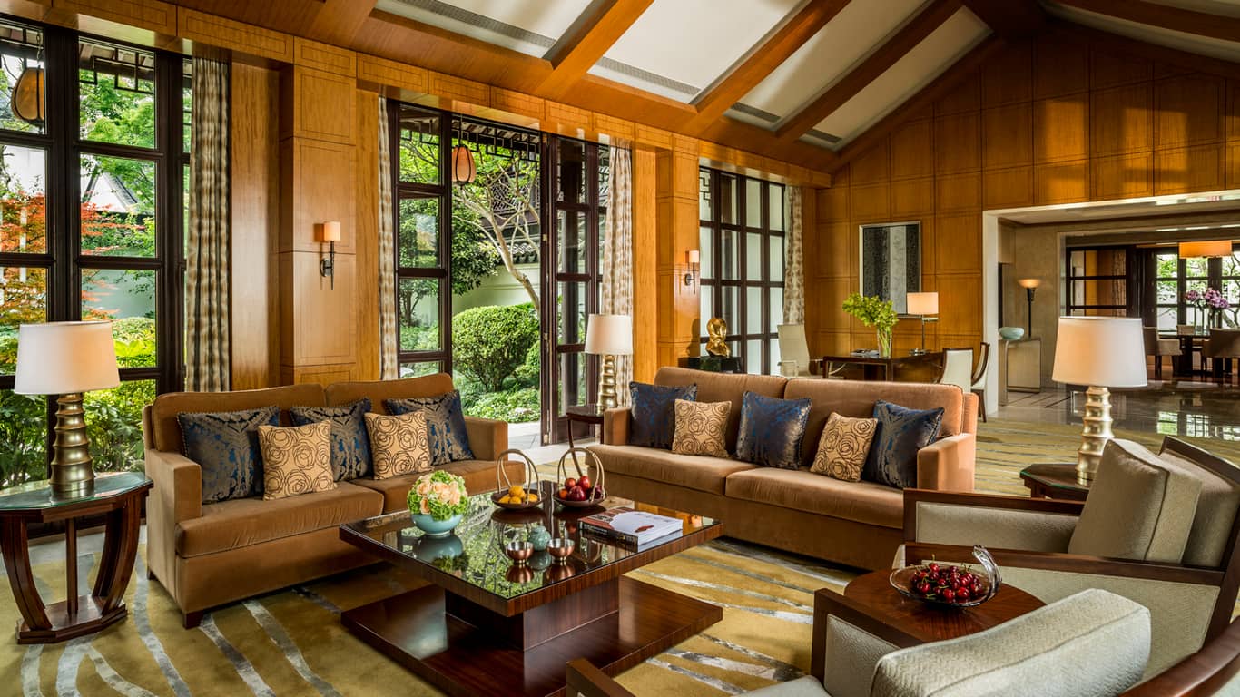 套房設(shè)有特大床臥室和獨立起居區(qū),讓您盡情放松休憩,憑窗遠眺可飽覽布局精巧的花木園藝和充滿詩情畫意的西湖景色。
