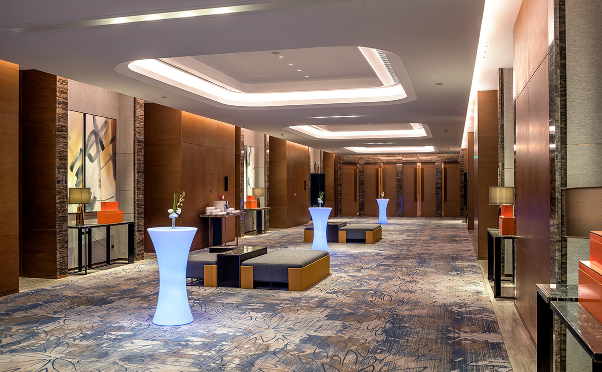 總面積1,050平方米的大宴會廳裝飾風(fēng)格豪華而現(xiàn)代,擁有12米的凈空挑高,850平米的宴會前廳,安裝了可以“一分為三”的場地隔斷。