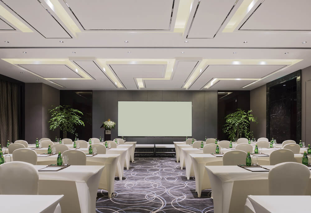 酒店擁有7間多功能廳,可靈活滿足中小型會議和宴會的需求,同時配有1間面積1,000平方米挑高9米的無柱式大宴會廳,配備90屏幕LED液晶顯示屏,是您商務(wù)洽談、社交活動的理想之選。