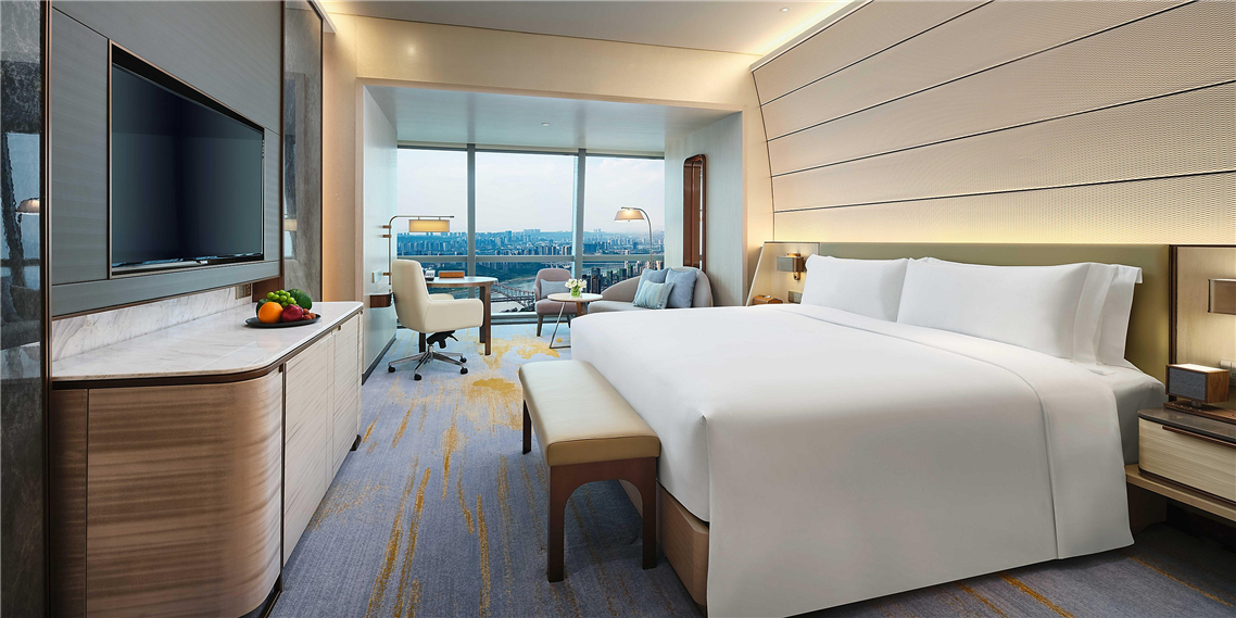 IHG旗下超高層城市酒店。位于重慶市中心著名景點朝天門廣場,坐擁長江、嘉陵兩江美景。酒店大堂坐落于42層天橋上,連通380間豪華客房與橫向摩天樓“水晶連廊”,連廊集合250米高空觀景臺與奢華餐飲。為您帶來全方位的難忘體驗,2000㎡ 會議空間采用落地玻璃設(shè)計,讓您的活動與戶外美景融為一體。