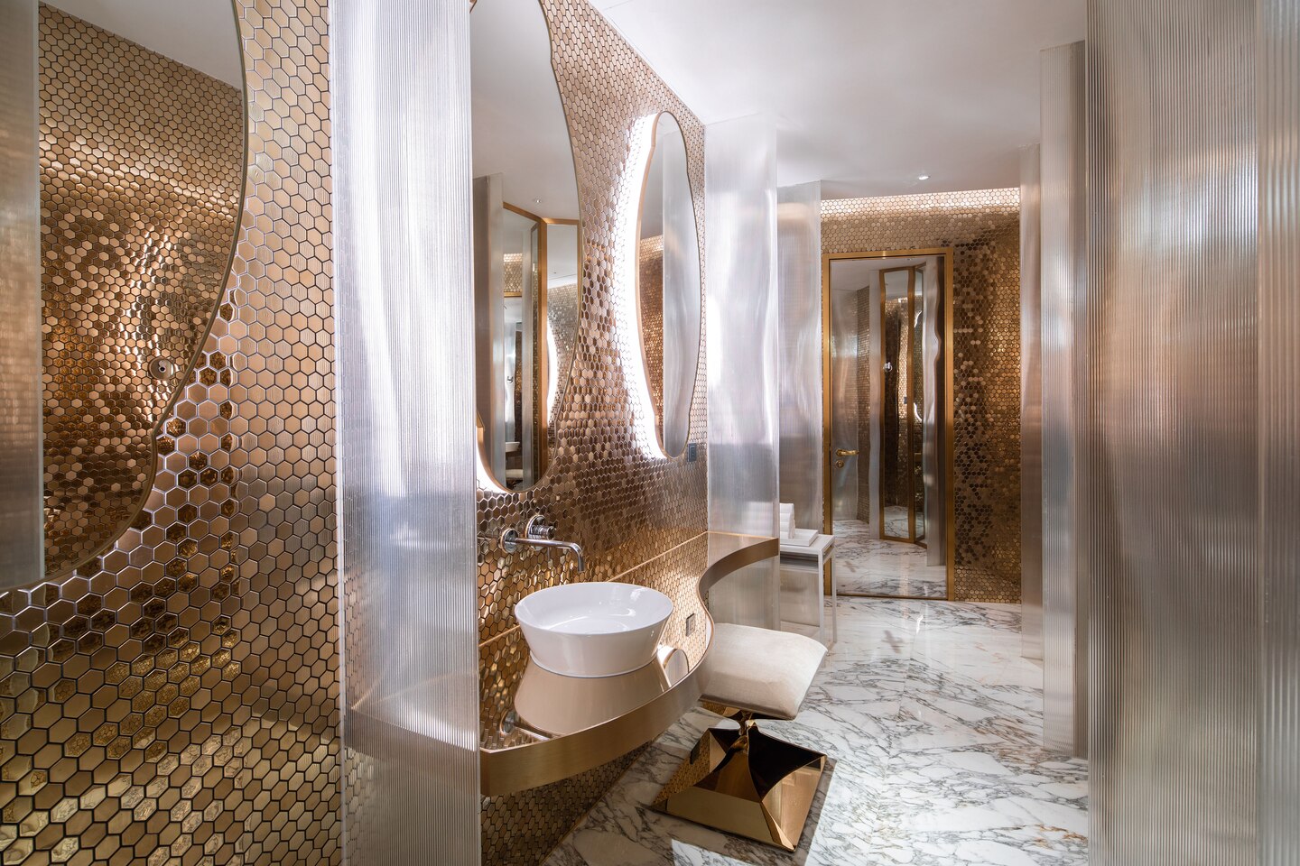 當(dāng)你踏入其中,第一眼看到的并非大堂,而是位于潮堂閃閃發(fā)光的Woobar酒吧,懸浮在天花板上的金屬片產(chǎn)生了波光粼粼的視覺效果,讓人印象深刻。