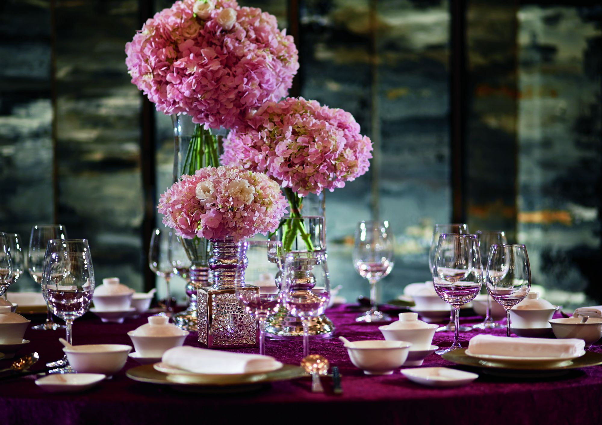 供新人禮成的麗思卡爾頓宴會廳雍容富麗,位于酒店的二層,35盞由Murano(意大利威尼斯玻璃工業(yè)中心)打造的琉璃牡丹花吊燈,可調(diào)節(jié)燈光亮度,為婚典帶來無盡浪漫。
