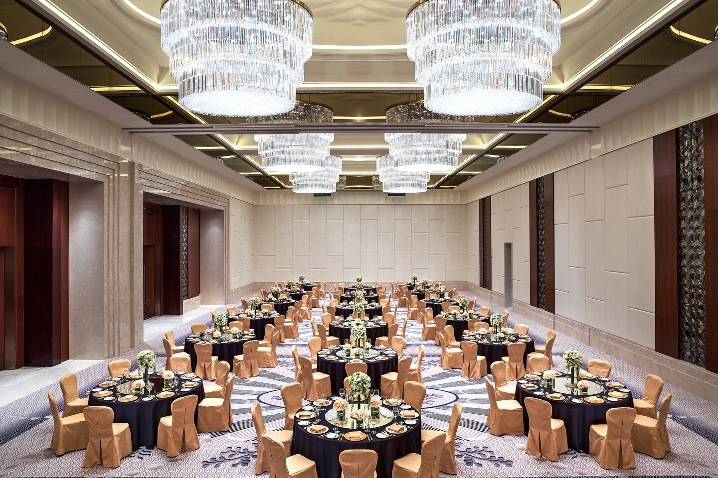 該多功能場地采用靈活的布局設(shè)計(jì),墻面裝飾的華麗繡花絲綢和閃爍水晶吊燈盡顯優(yōu)雅豪華氣息,從備受矚目的慶?;顒印⒆窖鐣缴虅?wù)會議,這里可滿足客人的各種場合需求。