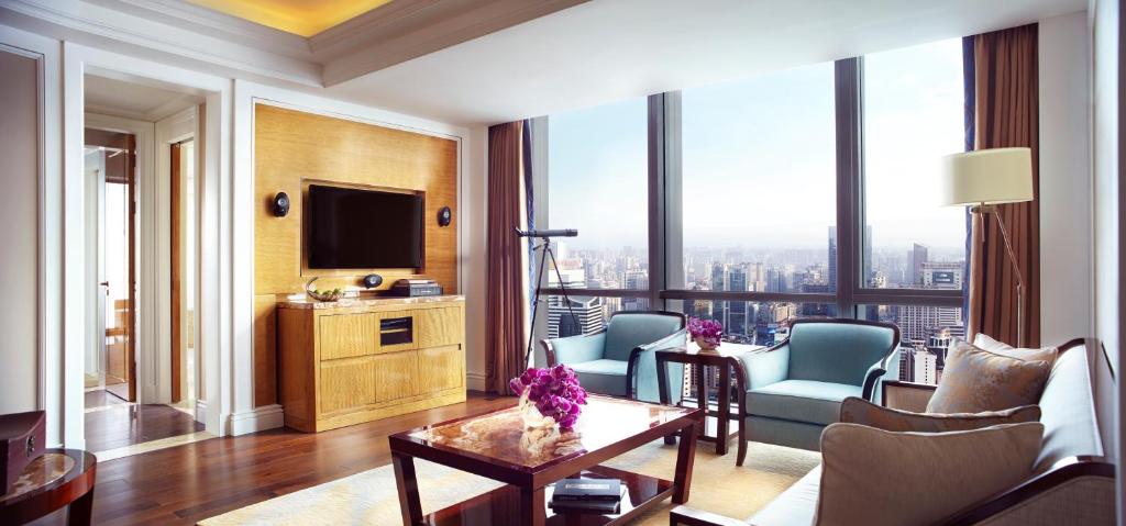 成都富力麗思卡爾頓酒店提供免費WiFi和豪華寢具,并享有天府廣場和成都天際線一覽無余的景致。