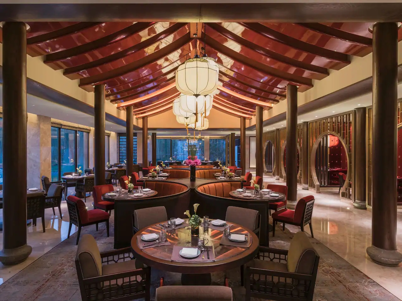宏偉的中庭設(shè)計(jì)將餐廳分為三個(gè)主要用餐區(qū),均可欣賞曲江湖的壯麗景色。