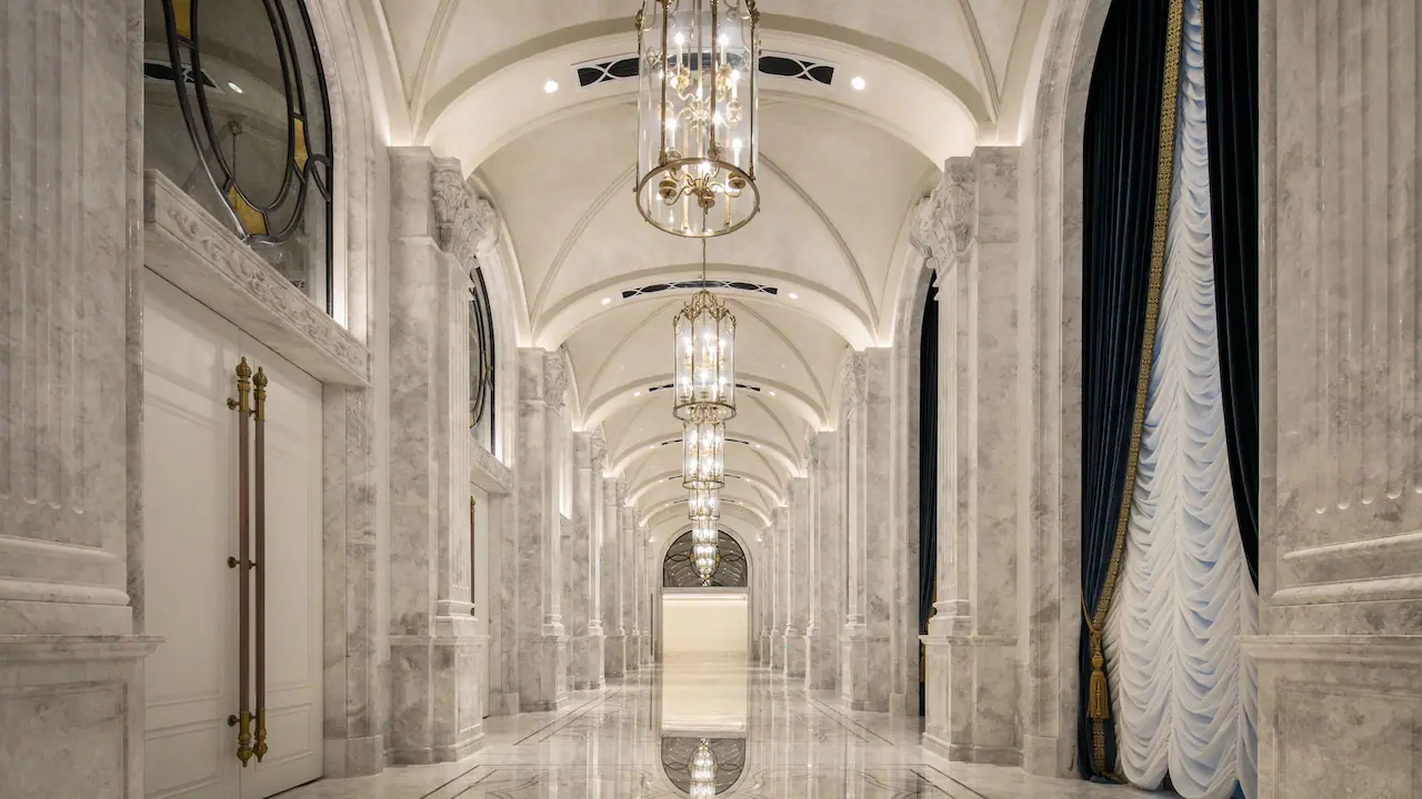大堂中央獨(dú)具魅力的灰藍(lán)色樓梯在精雕細(xì)琢的大理石襯托下更顯氣勢(shì)宏偉。