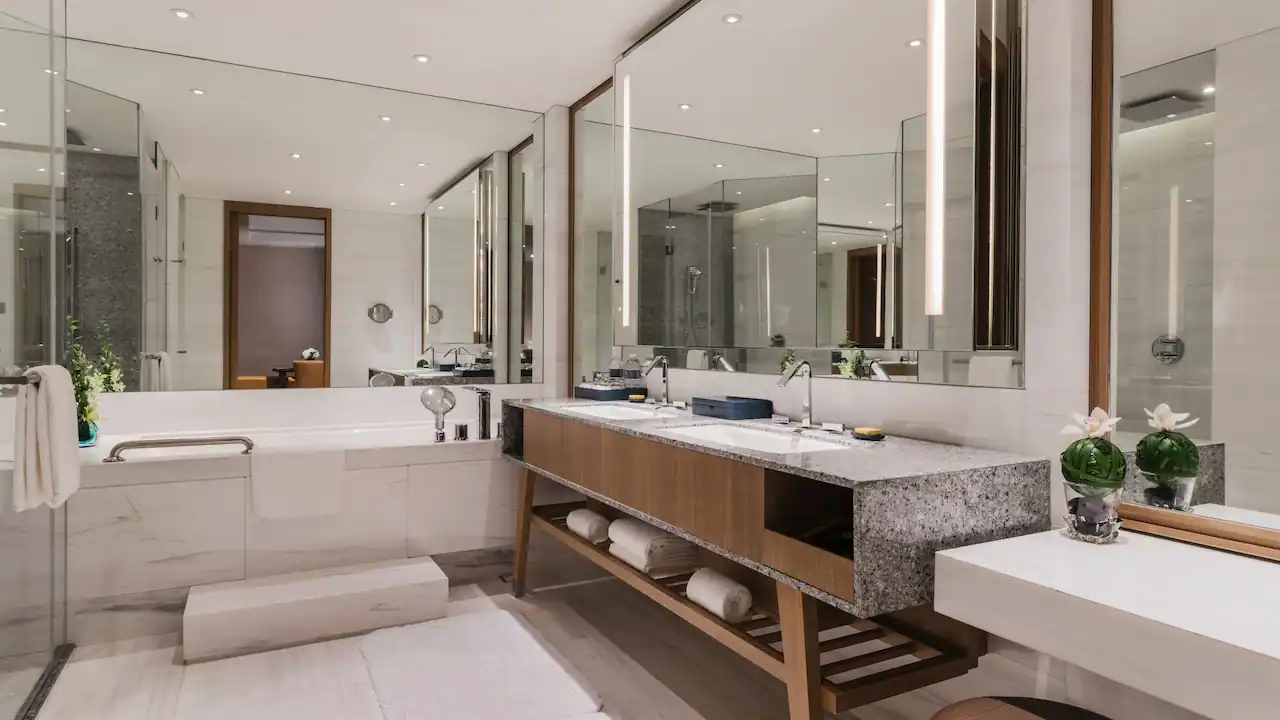 客房設(shè)有內(nèi)令人神清氣爽并配備步入式淋浴間和浸泡式浴缸的大理石浴室。