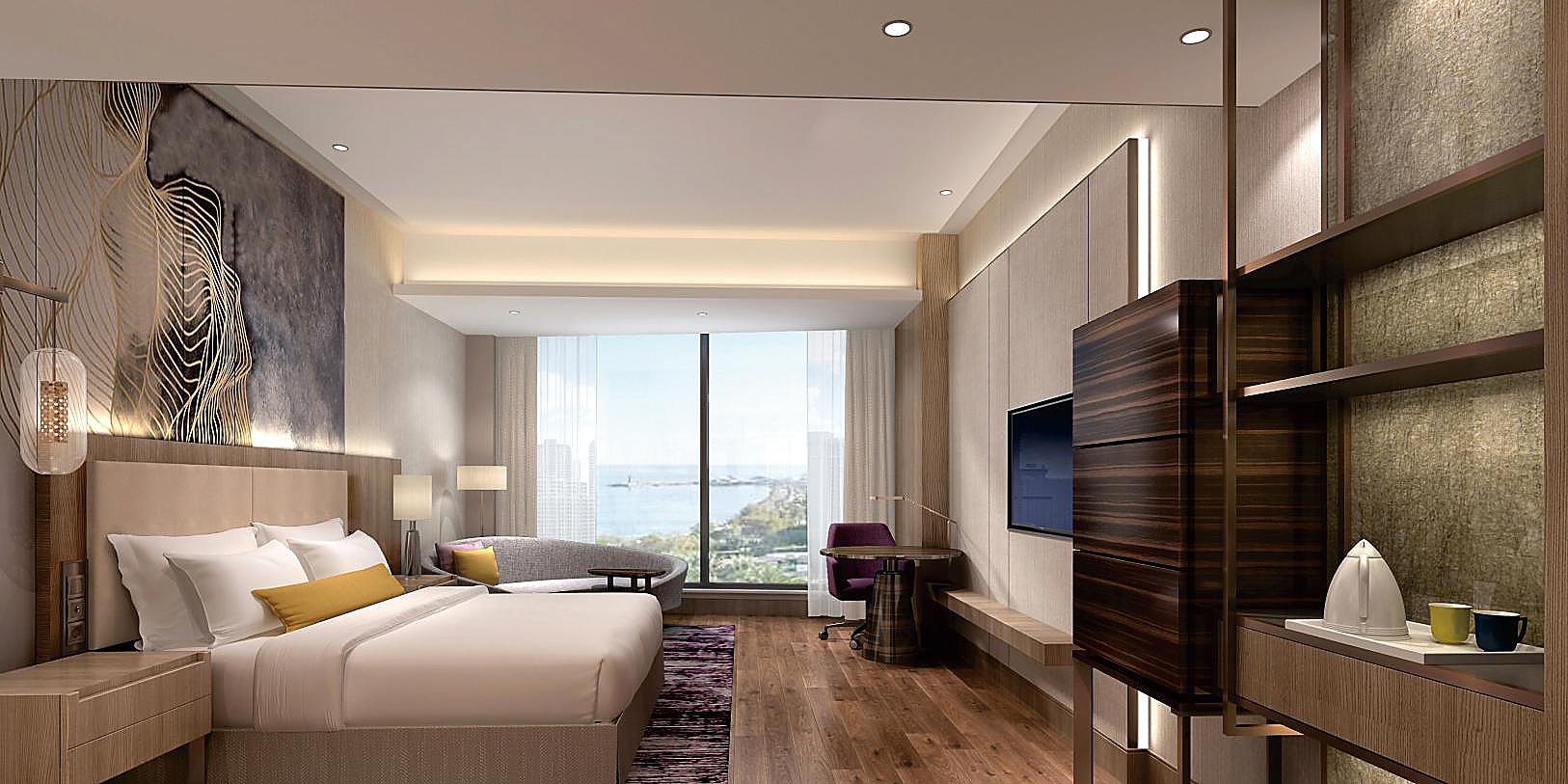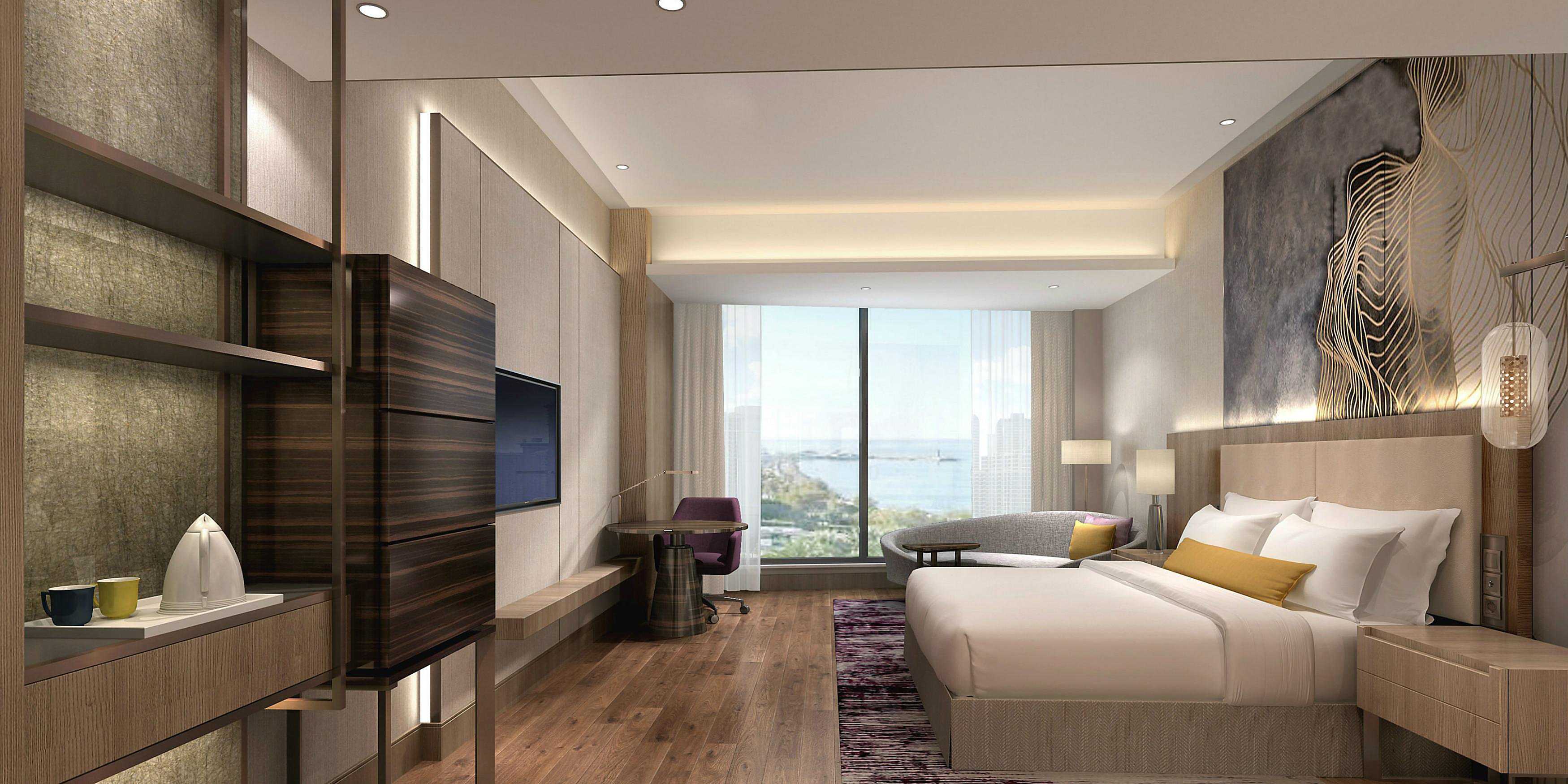 酒店擁有320間時尚雅致的客房及套房,超大的全景落地玻璃窗可盡覽銀灘一線景致。