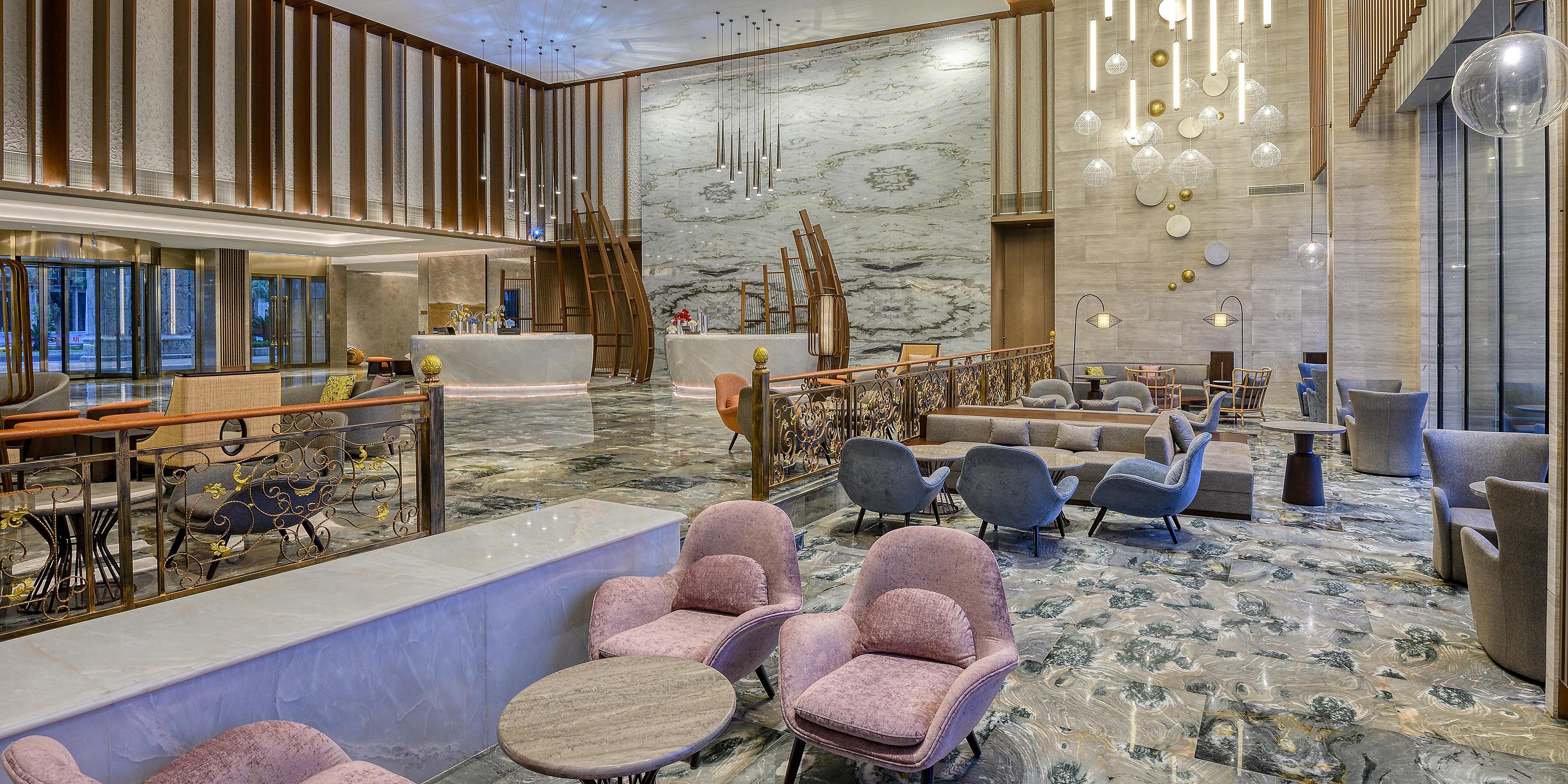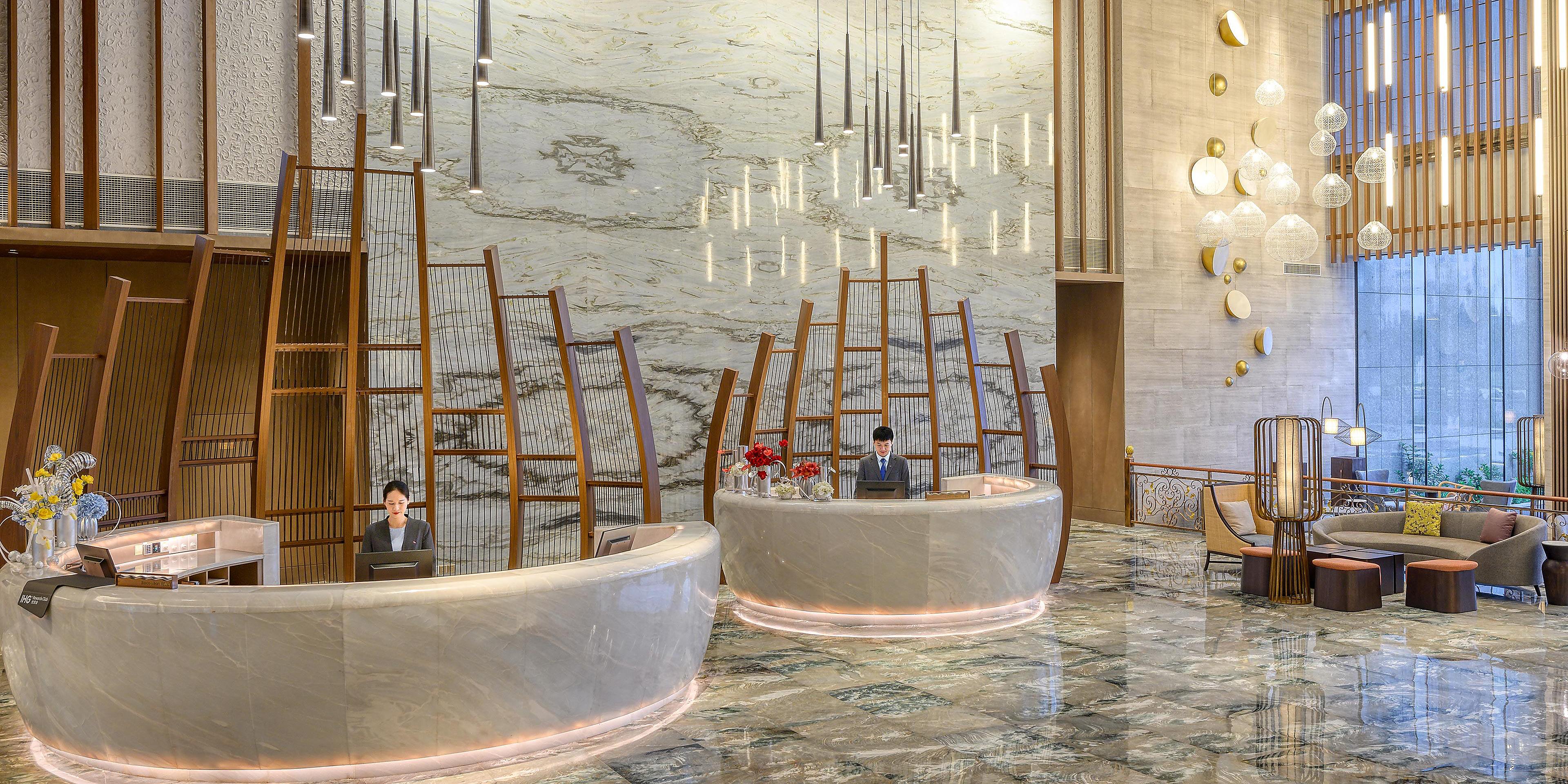 大堂酒廊寬敞明亮,舒適宜人,戶外區(qū)域擁有親水下沉式休閑平臺,四面碧水環(huán)繞,是小憩或洽談的理想場所。
