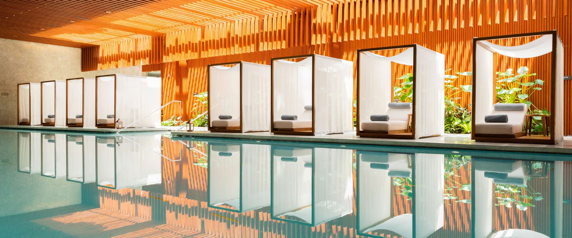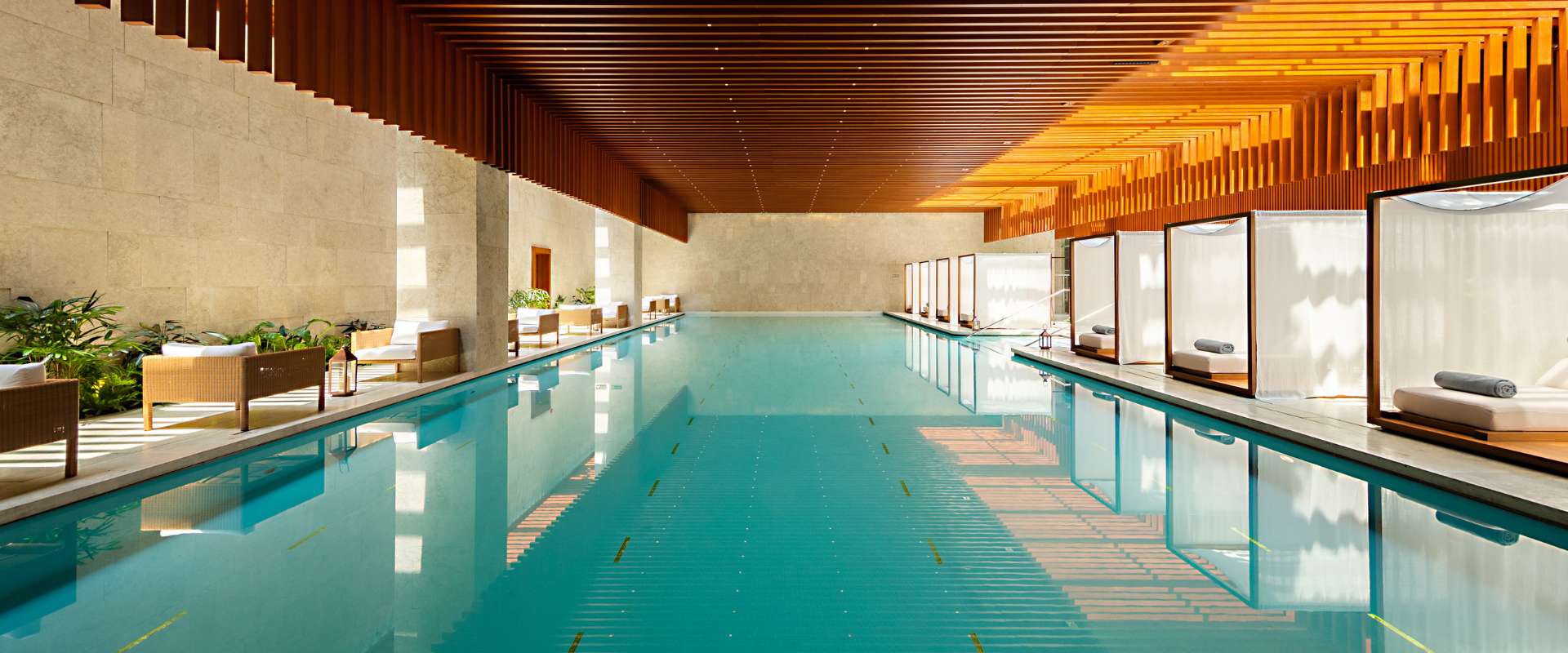 水療中心的核心是一個(gè)25米長(zhǎng)的室內(nèi)溫水游泳池,周?chē)h(huán)繞著雕像般的柱子,讓人回想起羅馬浴場(chǎng)的宏偉。