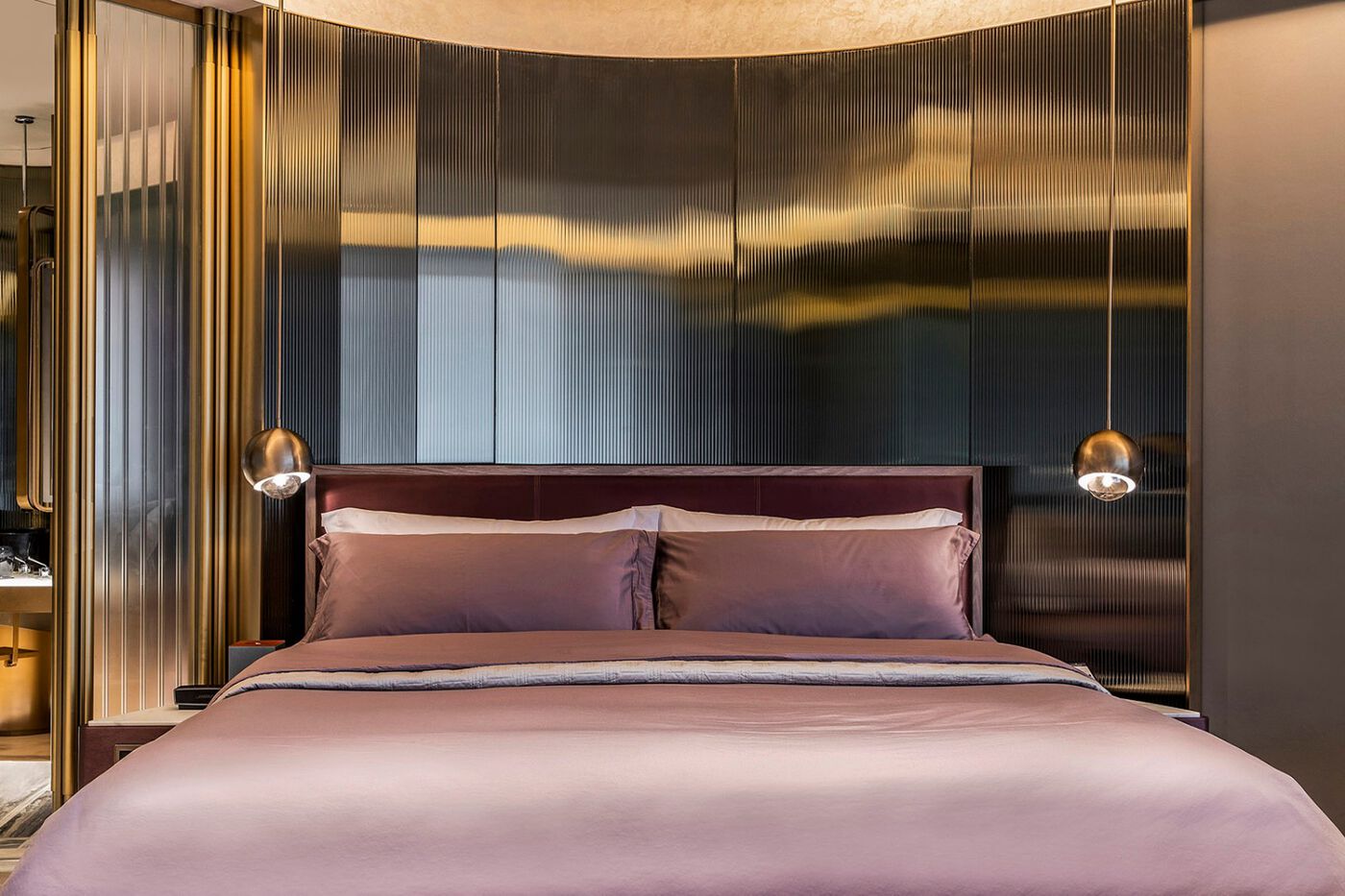 墻面玻璃鏡面材質(zhì)的反射及光影塑造使水紋倒影映滿整個套房