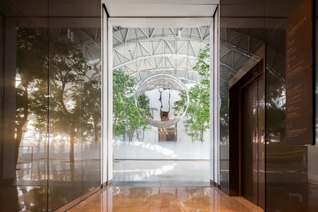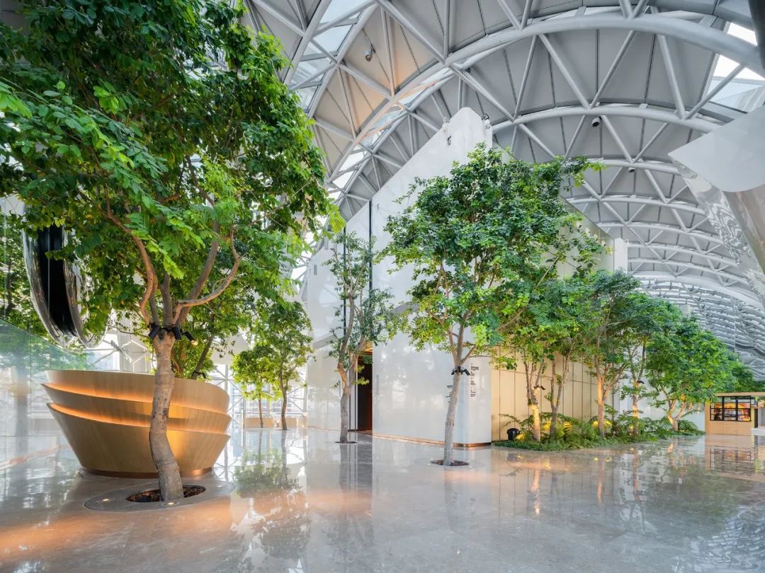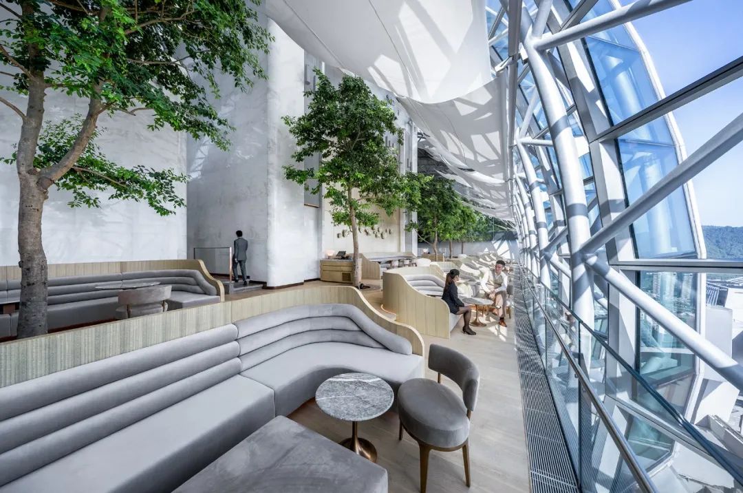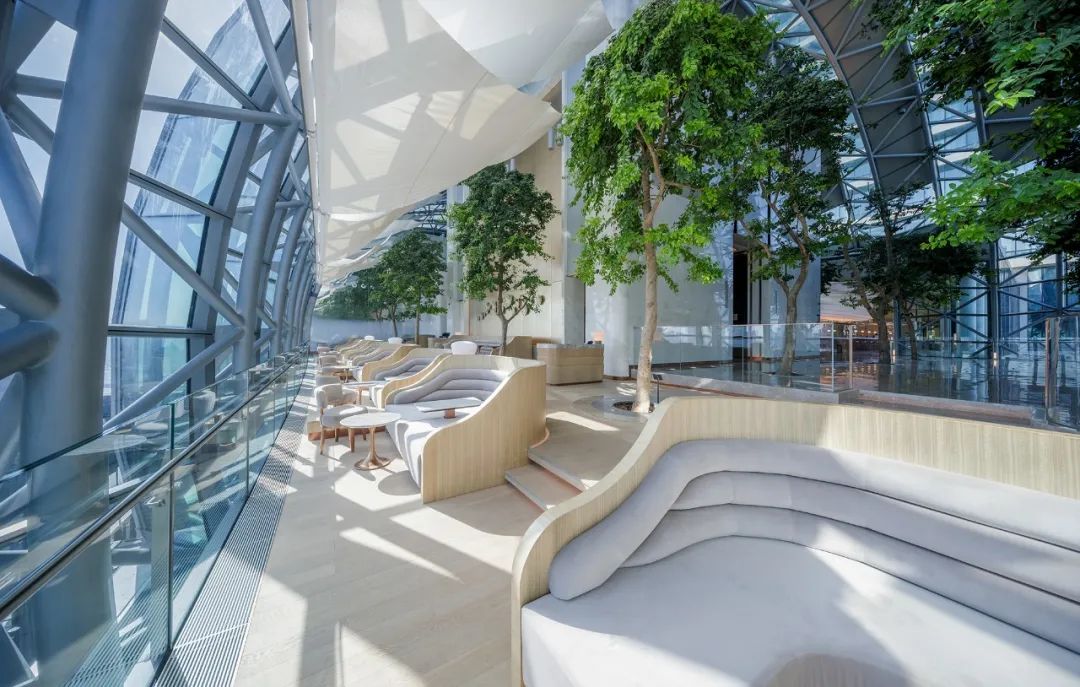 序列高聳的弧形穹頂之下,綠植以陣列排布的形式自由向上生長(zhǎng),結(jié)合樹(shù)下輪廓圓潤(rùn)的木質(zhì)座椅,烘托“覽”酒廊的愜意格調(diào)。光影與綠植于高空中營(yíng)造山城景觀,為自由漫步的客人提供最好的去處。
