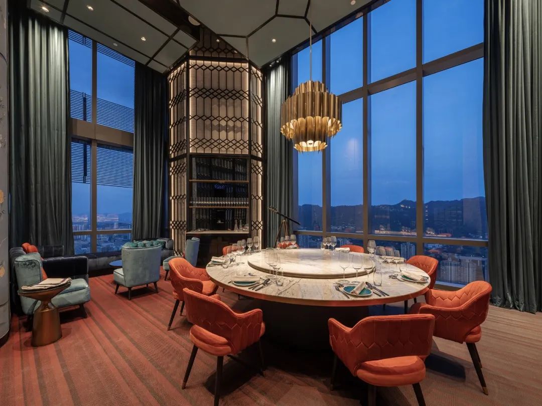 宴會(huì)廳將兩江交匯的顏色提煉為設(shè)計(jì)靈感,以藍(lán)色和金色延展天空和城市景觀,波浪形頂部與窗外波光粼粼的江面遙相呼應(yīng),開(kāi)闊的場(chǎng)景氛圍升華客人的感官體驗(yàn)。
