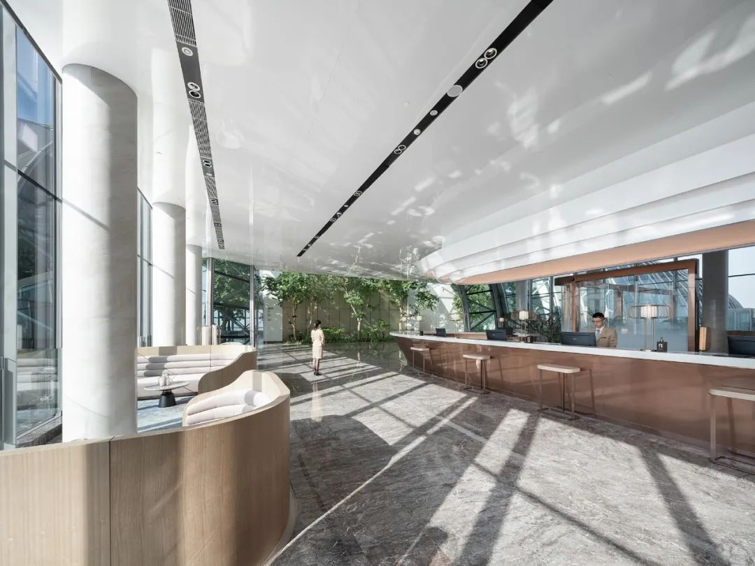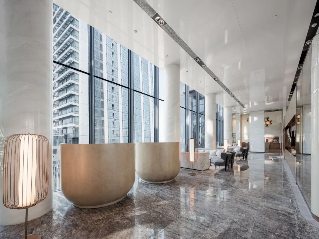 酒店優(yōu)越的地理位置能將江水、山脈、城市和天空等各色美景一覽而盡。設(shè)計(jì)結(jié)合了這些元素,為客人營(yíng)造出“江中航行”的獨(dú)特體驗(yàn),既融合了城市的蓬勃律動(dòng)和航運(yùn)精神,又兼具愜意和奢華感。