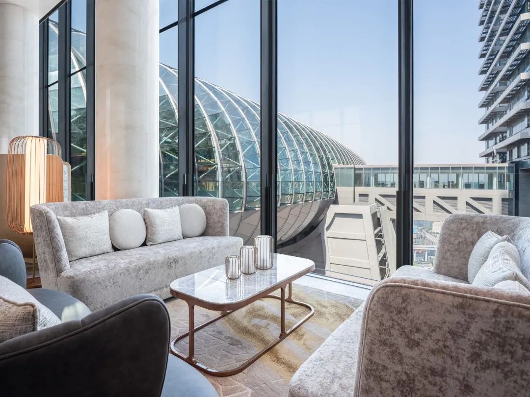 坐落于42層天橋上,連通380間豪華客房與橫向摩天樓“水晶連廊”,連廊集合250米高空觀景臺(tái)與奢華餐飲。酒店內(nèi)部的設(shè)計(jì)延續(xù)了建筑造型的“風(fēng)帆”概念,基于航海美學(xué),航行般的流線型特征和傳統(tǒng)手工藝圖案交織在一起。
