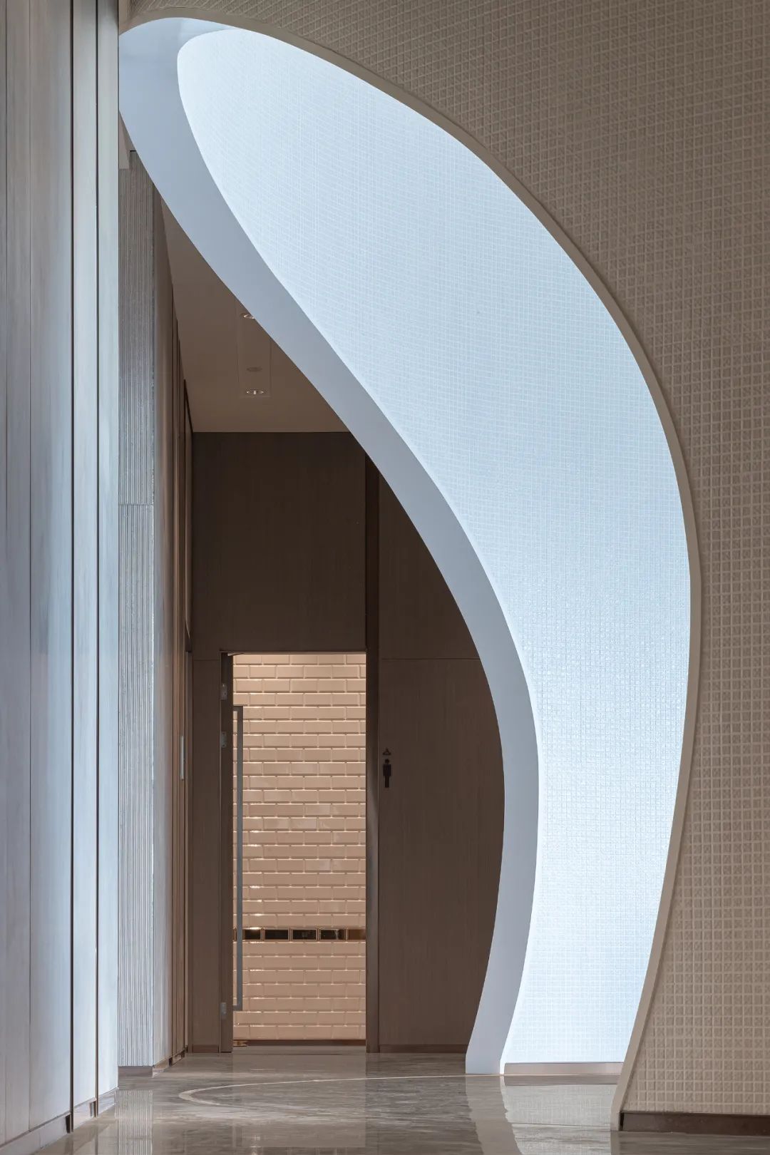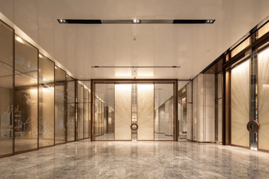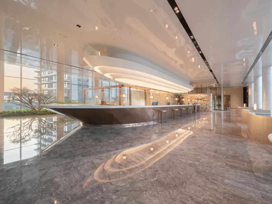 接待臺(tái)面延續(xù)航行船只的造型,加設(shè)弧形燈光裝置,以上下呼應(yīng)的手法演化江中游行時(shí)水面呈現(xiàn)的倒影景觀,形塑航行意象。在燈光與自然光線的映射下,空間形成內(nèi)外景色的貫通,伴隨行走動(dòng)線,場(chǎng)景的畫(huà)面內(nèi)涵由遠(yuǎn)及近不斷顯現(xiàn),讓人感受到開(kāi)闊的格局中越發(fā)清晰的認(rèn)知印象。