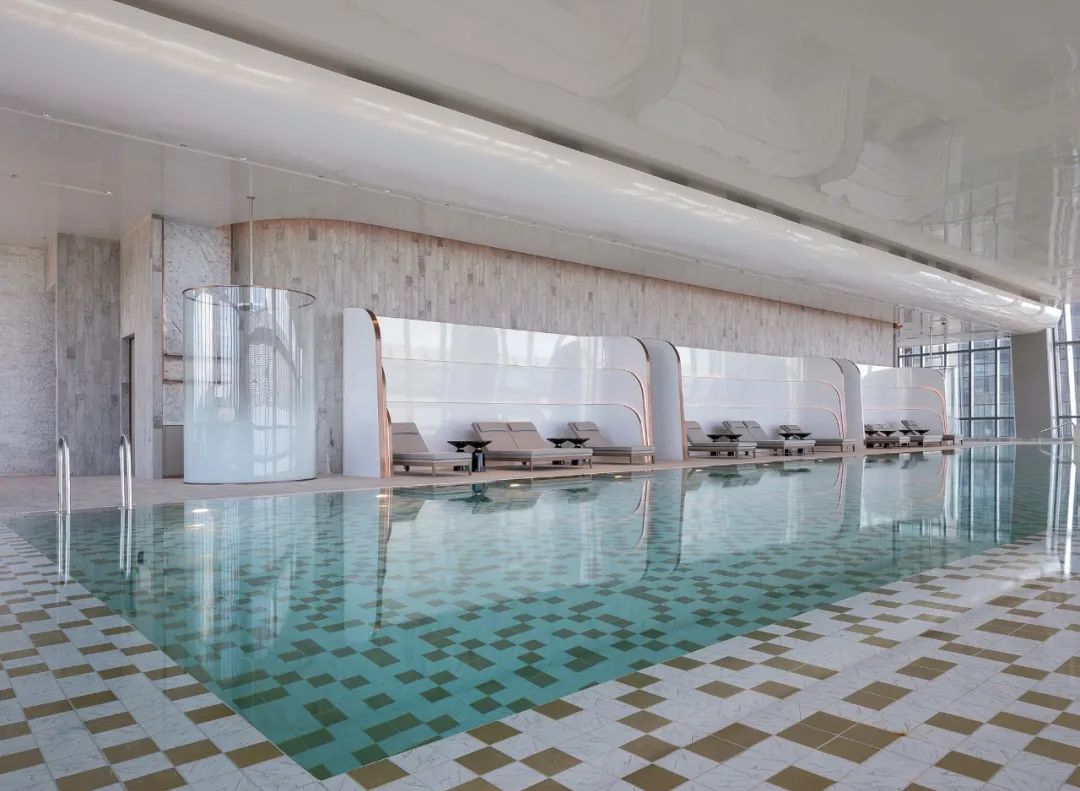 除酒店區(qū)域之外,CL3與Safdie Architects還共同設(shè)計(jì)了住宅區(qū)大堂,以及42層水晶連廊內(nèi)的住宅區(qū)俱樂(lè)部等。俱樂(lè)部與主泳池回歸城市生活的律動(dòng),時(shí)尚的造型語(yǔ)言和輕盈的色彩激發(fā)身體內(nèi)的運(yùn)動(dòng)能量和社交細(xì)胞。