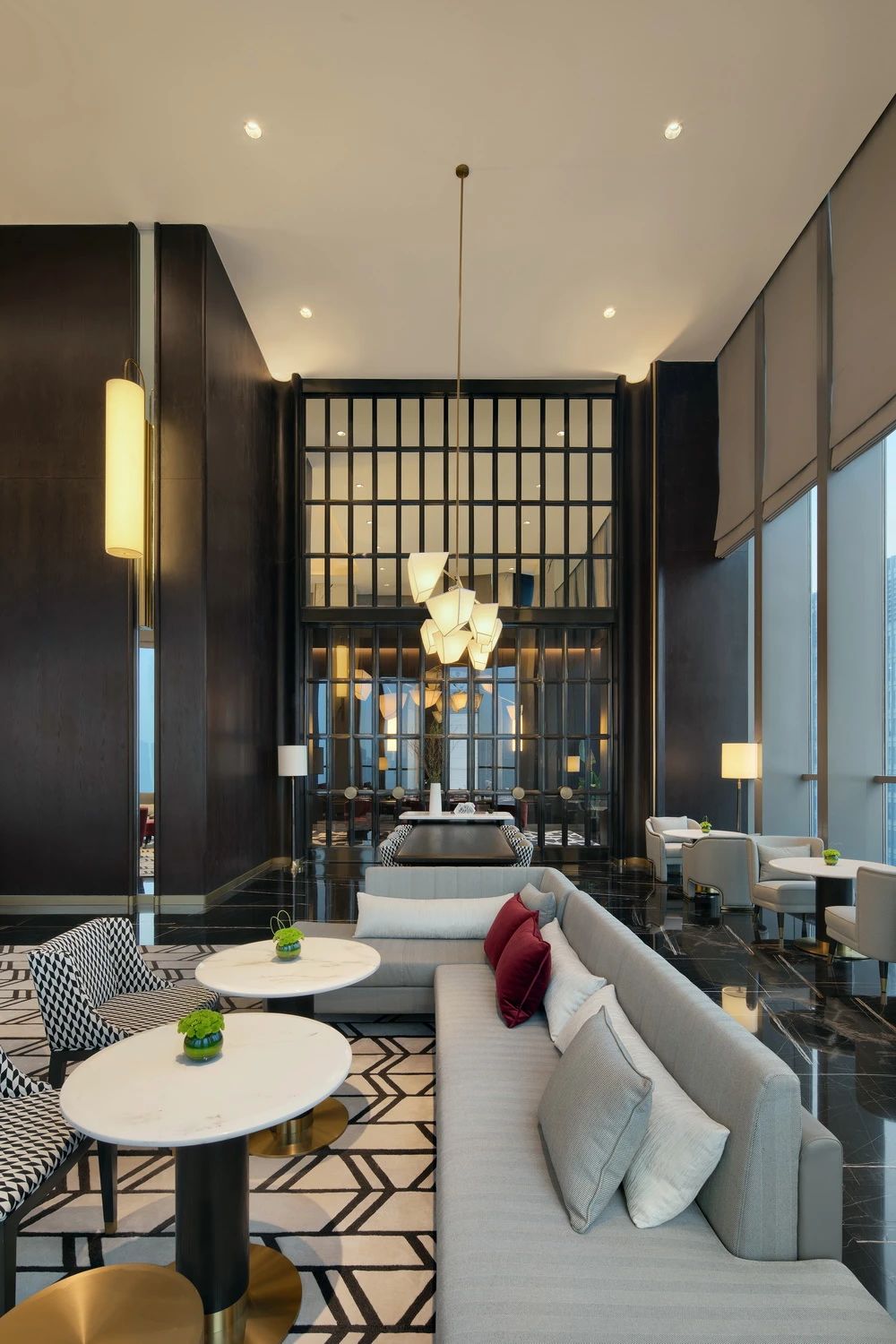 進(jìn)入酒店,大面景觀玻璃墻,使中心區(qū)繁華城市景觀盡收眼底?!耙挥[眾山小”的心境與開(kāi)闊的視野息息相通,凝聚為內(nèi)在氣韻。