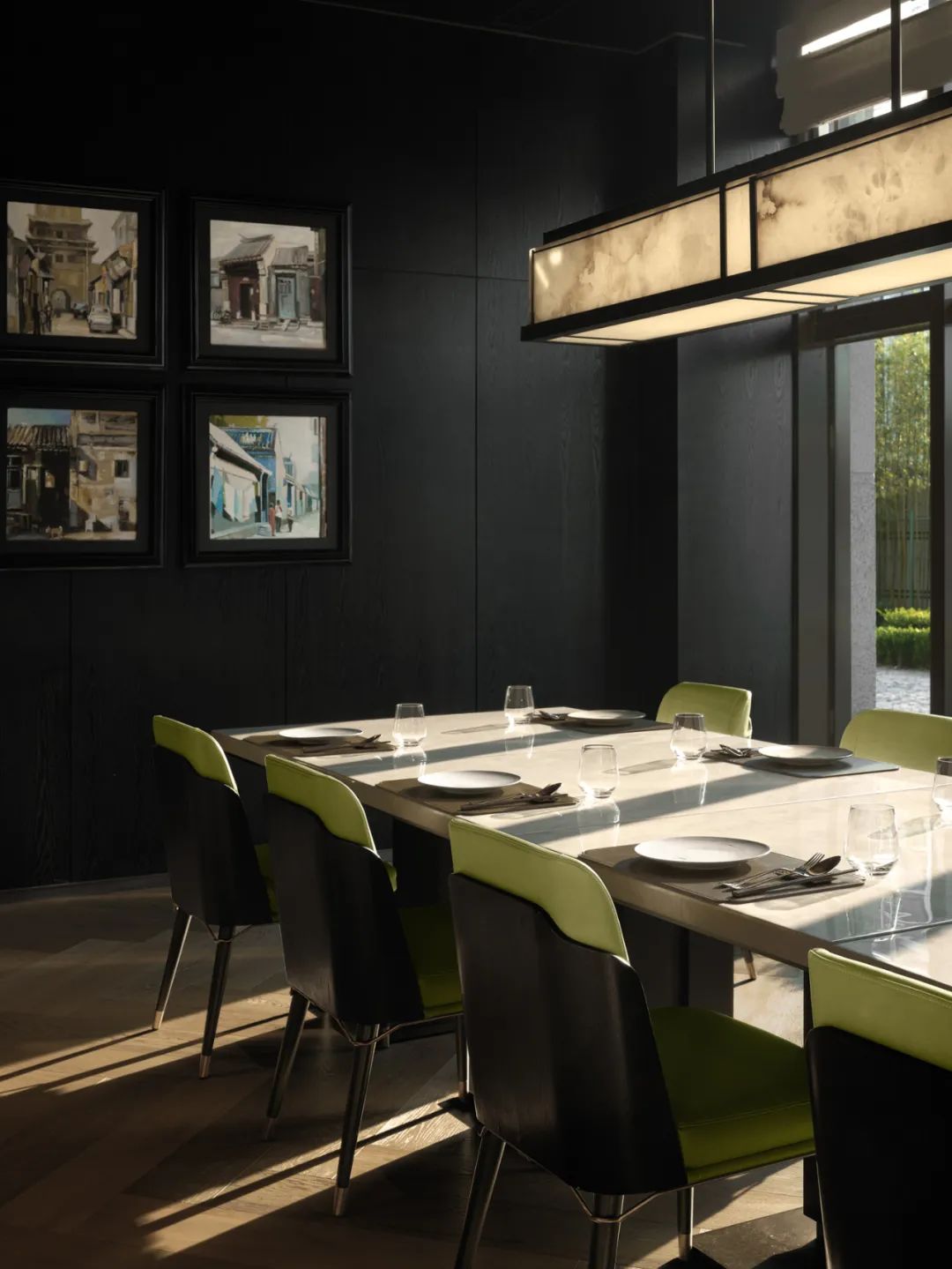 空間中一切的進(jìn)退、動(dòng)靜、平衡,被光影分割。豐富的質(zhì)地和氣質(zhì),疏密有致,奇趣而生,韻致的氣息在空間中生長(zhǎng)。錯(cuò)落放置在不同路徑上的取餐臺(tái),均由石材及活動(dòng)家具組合而成,與瓊?cè)A島上太湖石遙相呼應(yīng)?!扒嗍[四合鶯留語(yǔ),空翠連天雁遠(yuǎn)遊。南望帝京佳氣繞,五雲(yún)飛護(hù)鳳凰樓”。中餐廳基於黑白色調(diào)搭配醒目的綠色和優(yōu)雅的黃銅元素,讓空間呈現(xiàn)一派低調(diào)貴氣的精緻感。