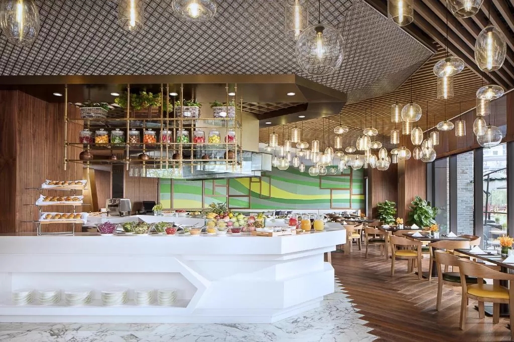 酒店內(nèi)的餐廳供應(yīng)當(dāng)?shù)孛朗澈吞﹪央取?/span>