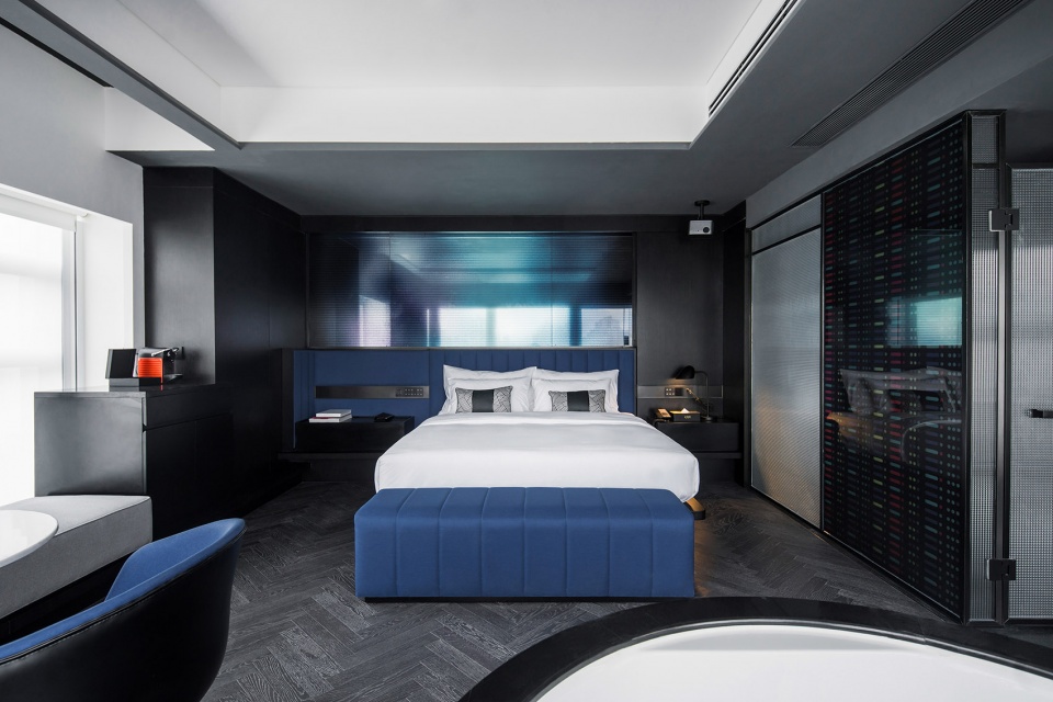 每間客房設置獨立門戶,入戶空間承擔了迎接賓客的重要職責,需要趣味化的儀式感,同時提升客房內(nèi)外承上啟下的私密感,以透影手法呈現(xiàn)的原創(chuàng)藝術(shù)品,點明空間主題,也希望空間質(zhì)感更柔軟。