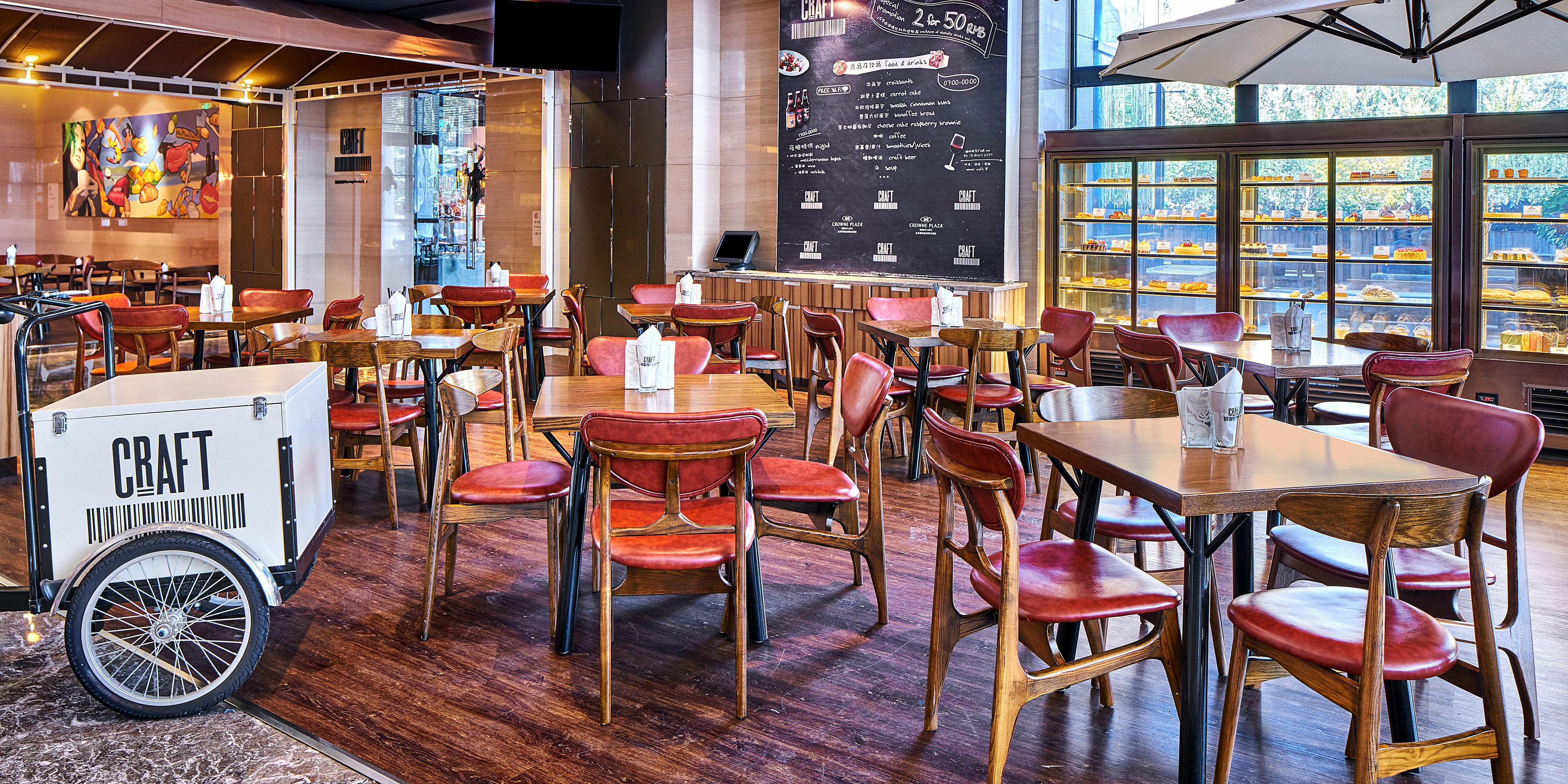 CRAFT位于酒店大堂右側(cè),白天供應(yīng)簡單、快捷、新鮮的早、中、晚餐。夜幕降臨,即時變身為品鑒美酒的輕松之所。