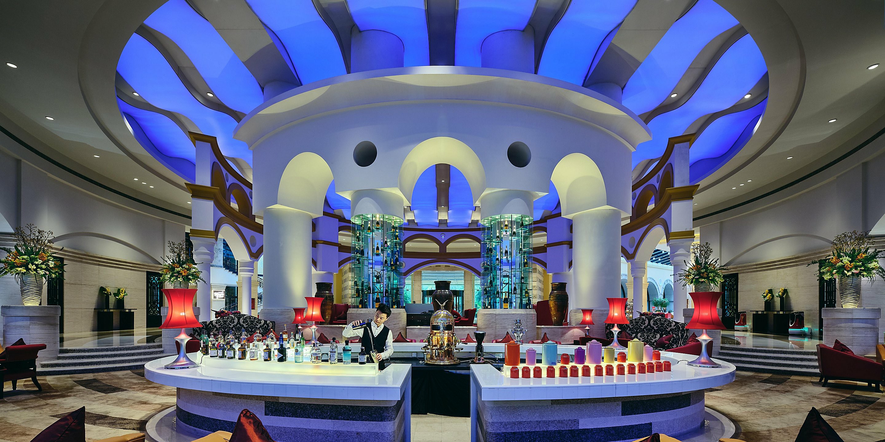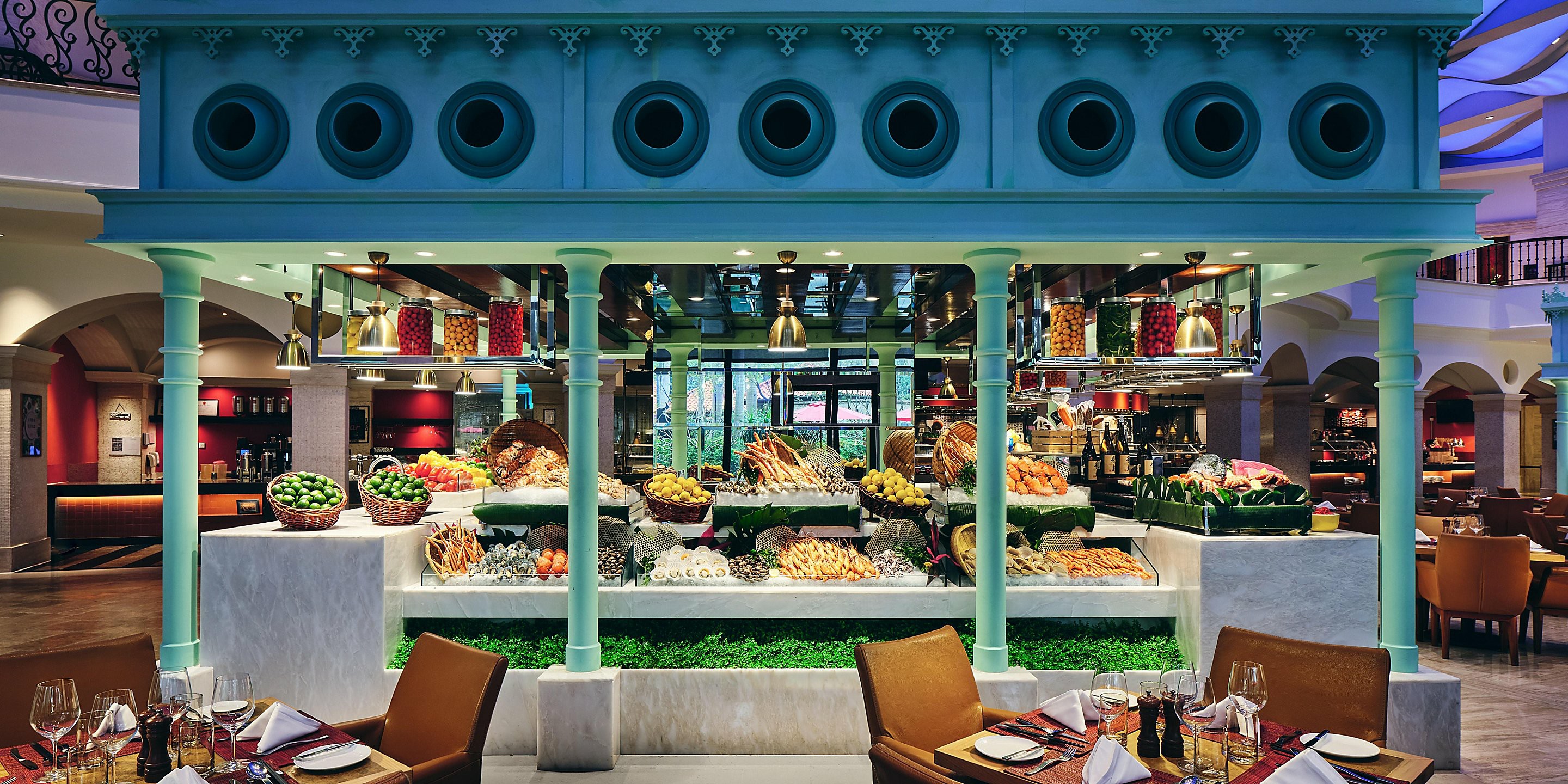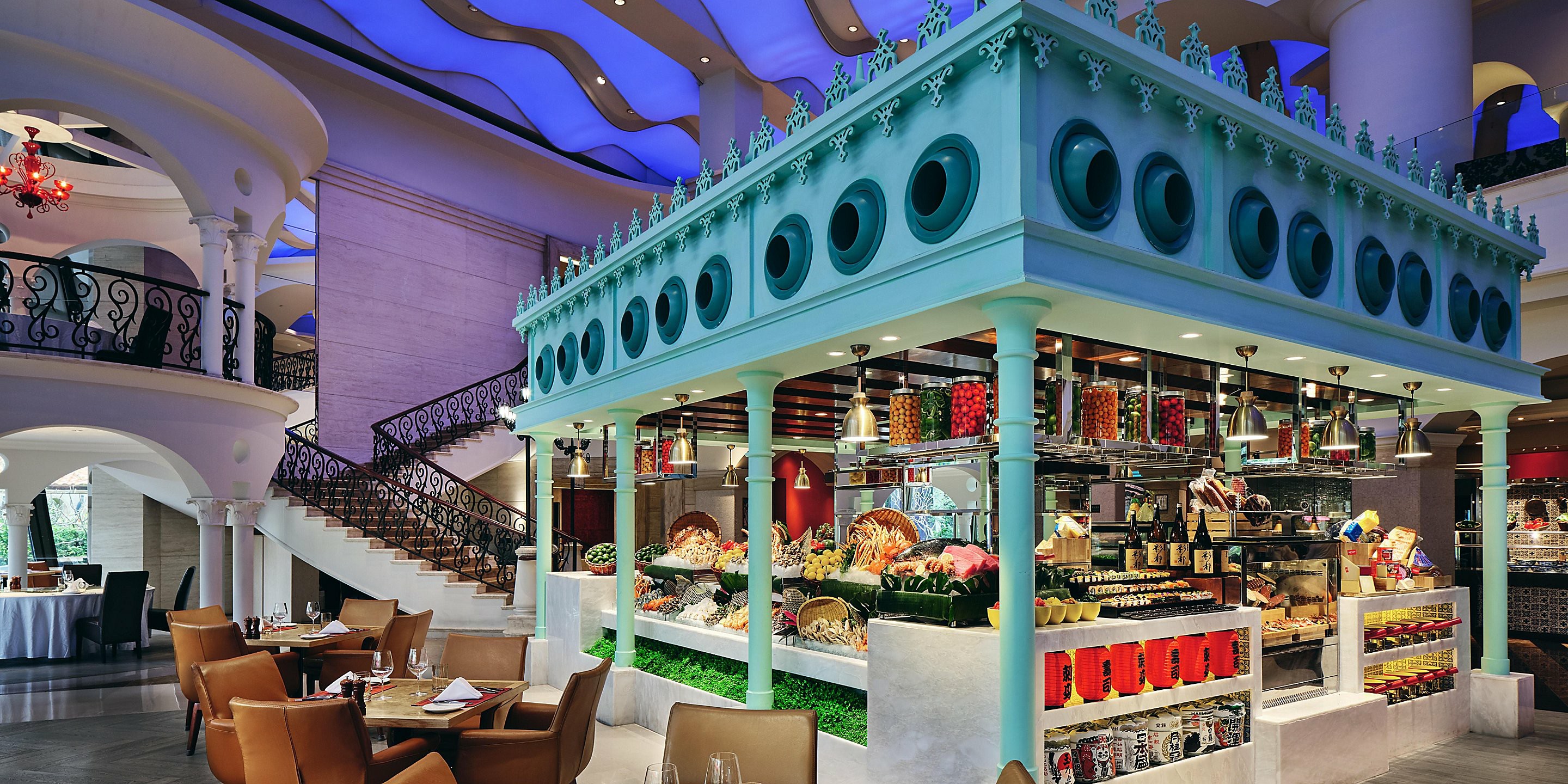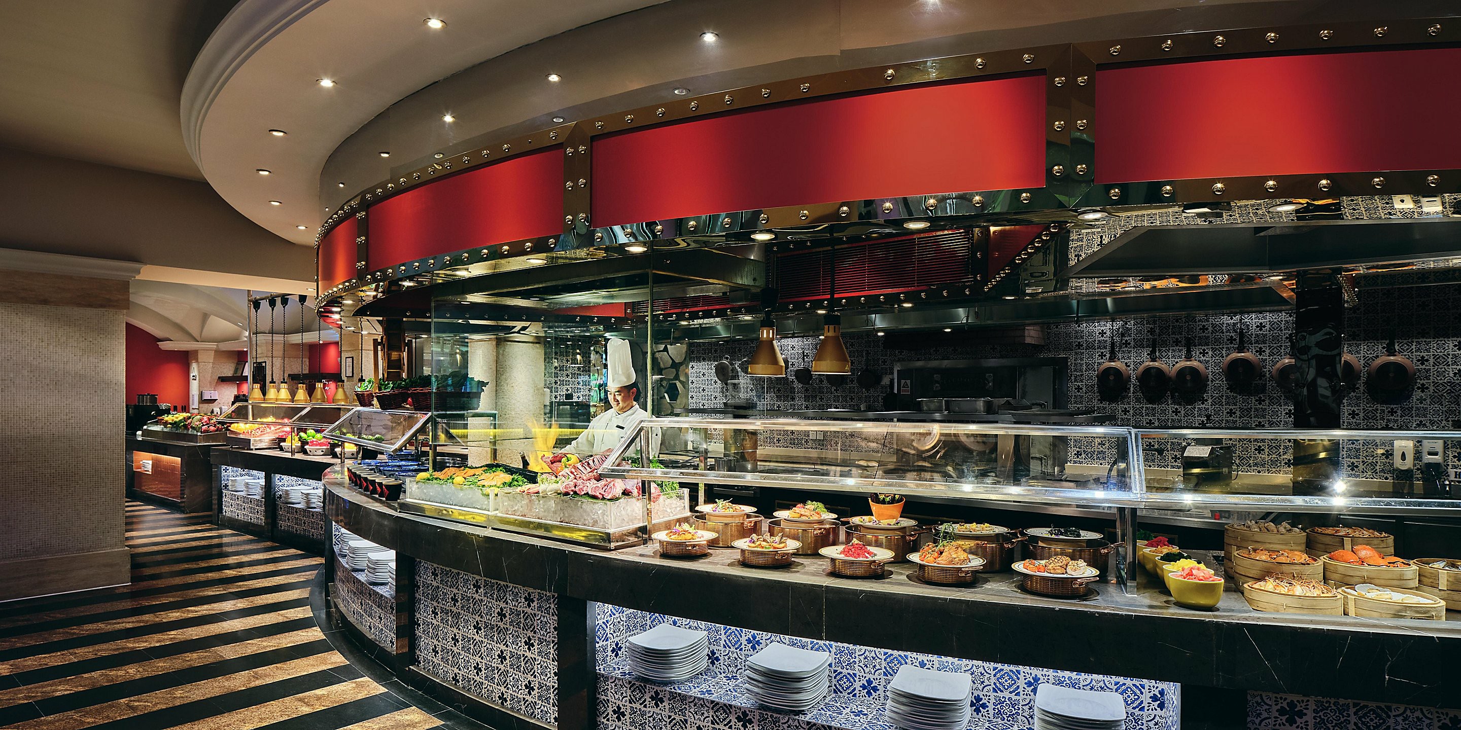 廣場(chǎng)咖啡廳搜羅中西知名菜式,無(wú)論是自助餐或零點(diǎn),都能迎合各國(guó)嘉賓的不同口味??扇菁{355位賓客同時(shí)就餐,并有兩個(gè)空中閣樓和池畔露天雅座供選擇。