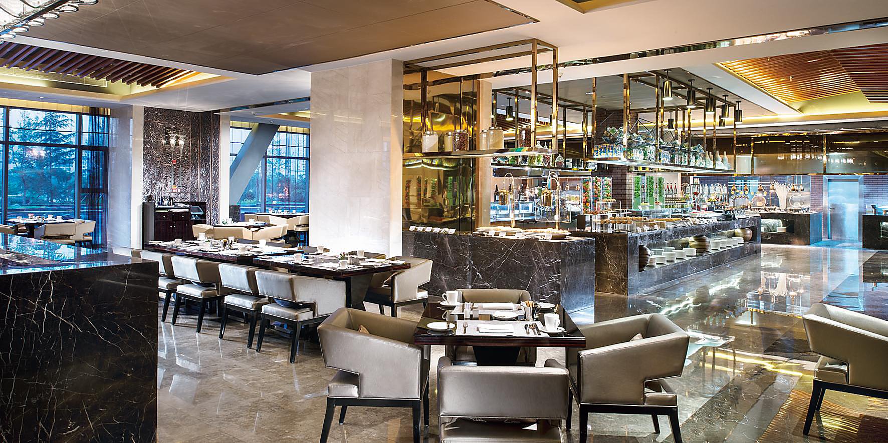 位于酒店一樓的河畔咖啡廳時尚雅致,設(shè)有182個餐位,提供環(huán)球自助美食,而且隨時為您用心烹制品種多樣的特色零點(diǎn)。